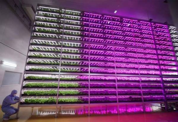 ฟาร์มนี้ใช้พลังงานจากหลอด LED ชนิดพิเศษซึ่งจะปล่อยคลื่นแสงในระยะที่เหมาะสมต่อการเจริญเติบโตของพืช